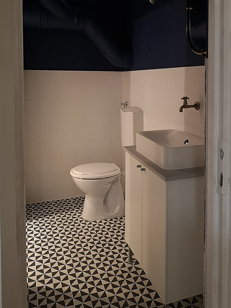 A három helyiségre alakítható ingatlanban , kialakítottak egy kis zuhanyzós fürdőt, mellékhelyiséggel, valamint egy teakonyhát.