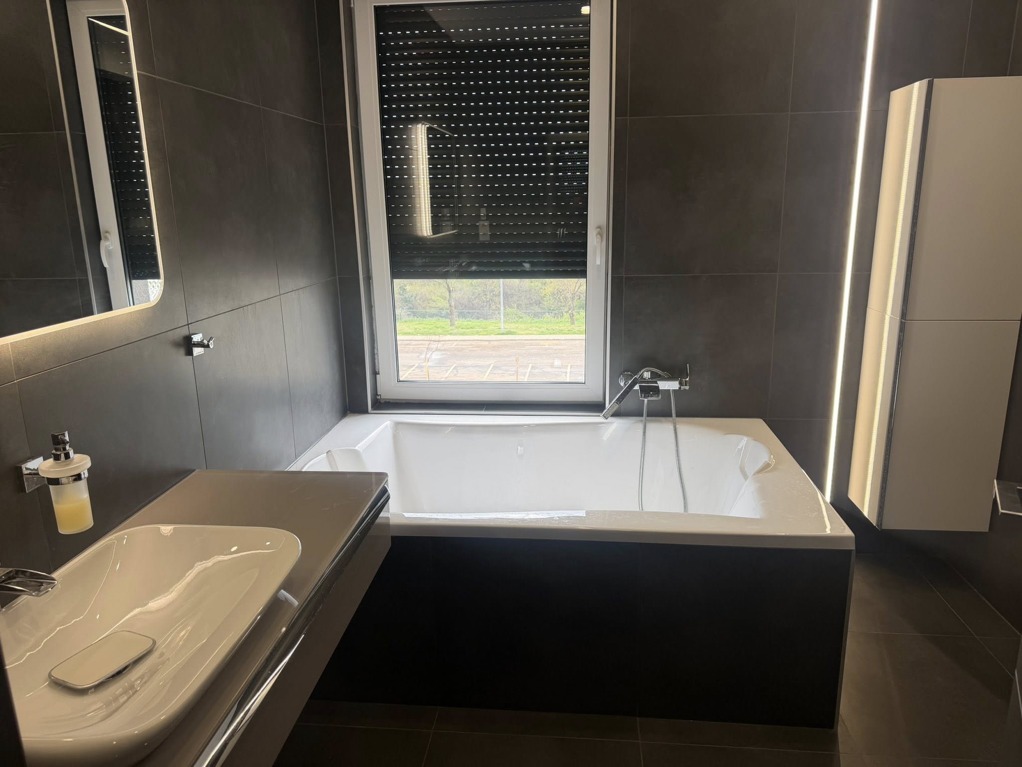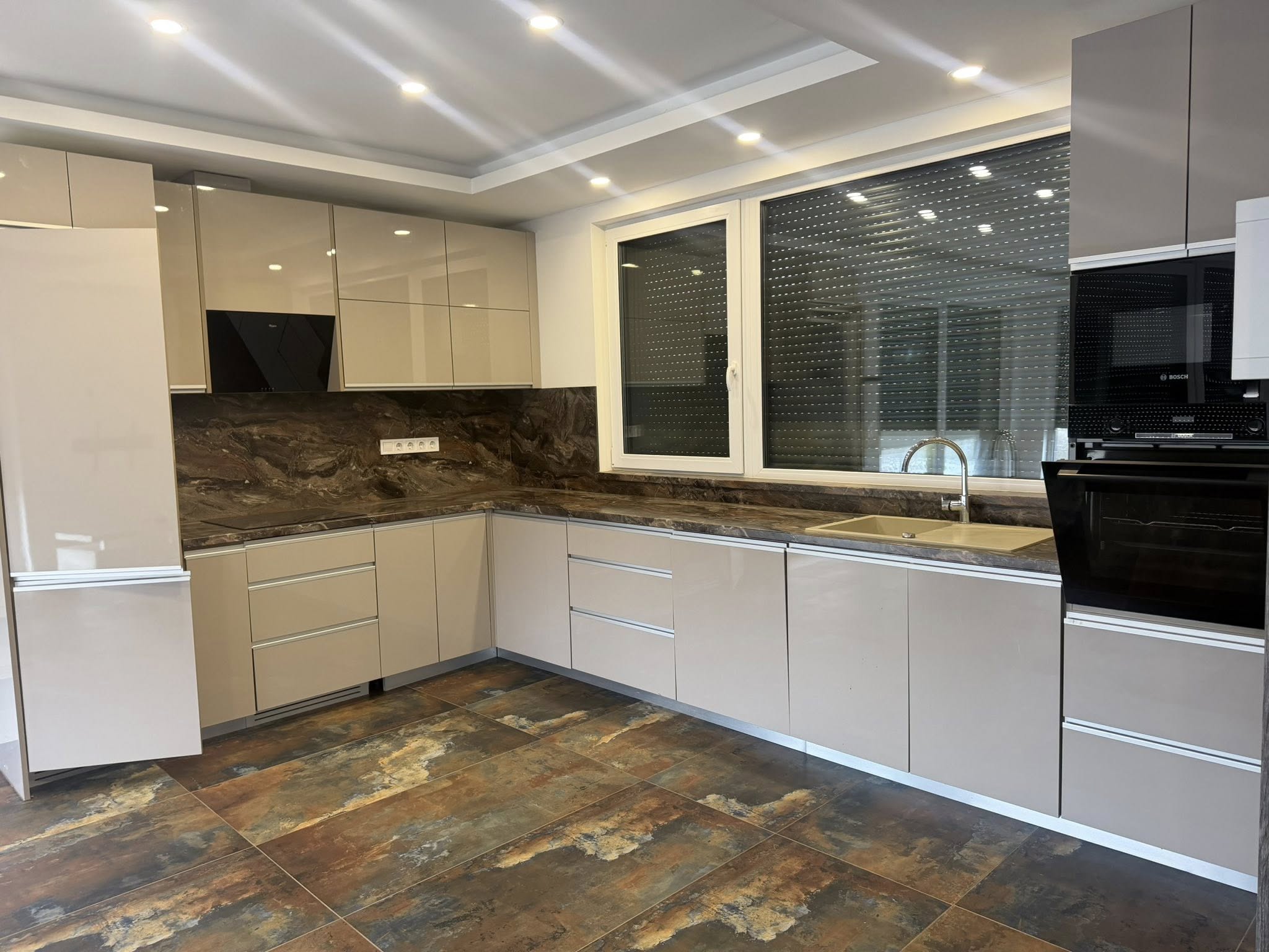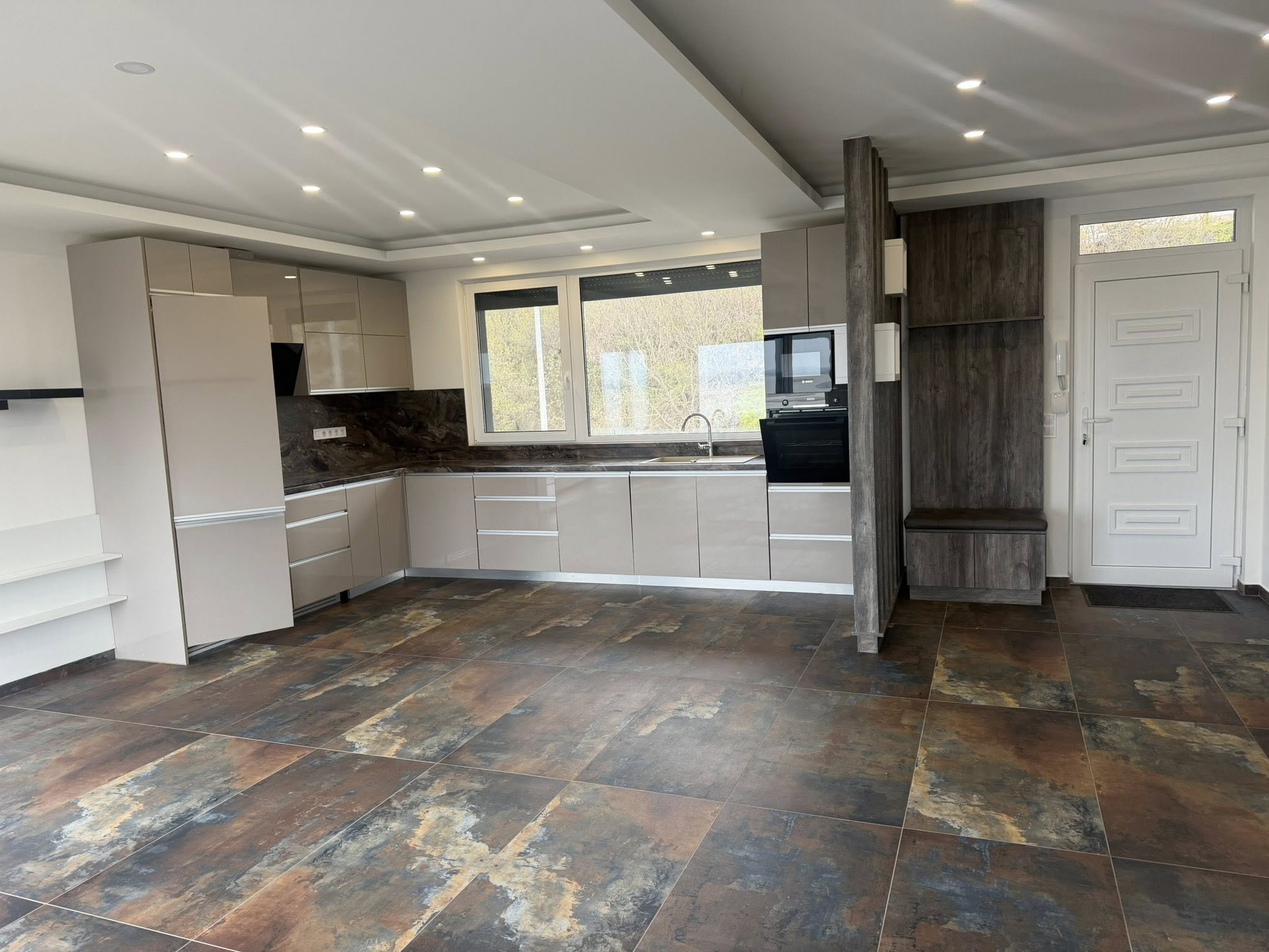 Különleges, minőségi csempékkel burkolva (120×120 + gérbe csiszolt), a hálószobákban pedig laminált padló található. A nappaliban 3D-s falak emelik tovább a lakás színvonalát. A konyhája teljesen gépesített.
