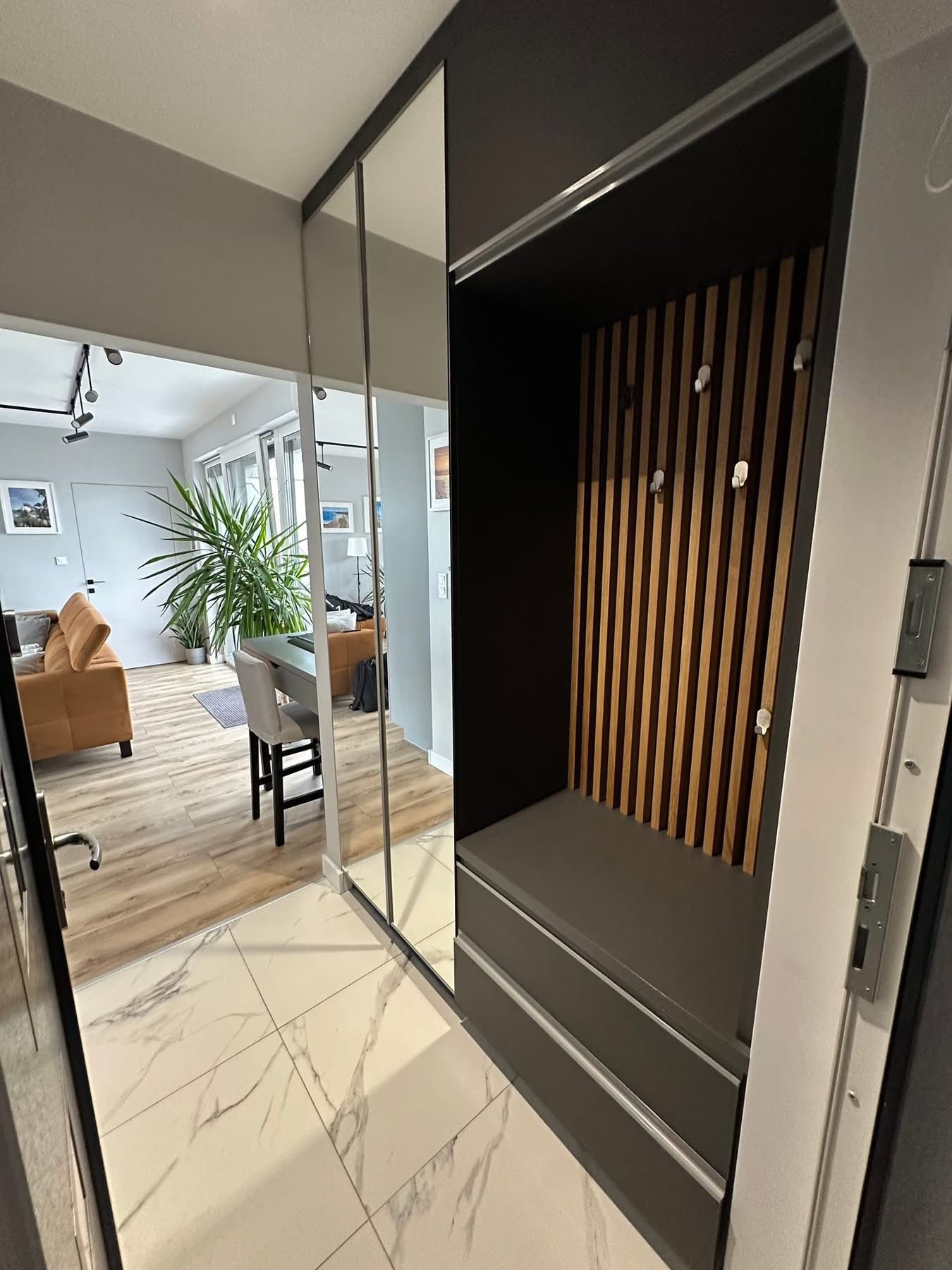 Az előszobában teljes beépített bútorzat biztosítja a kabátok és cipők elhelyezését, egyedi